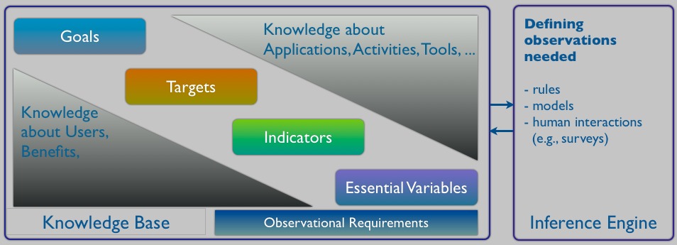 The generic goal-based approach to the identification of Essential Variables (EVs) that correspond to societal goals is depicted in Figure 1. In order to implement this generic approach, knowledge is needed about applications, activities and tools to quantify the indicators and to assess the progress towards the targets. Rules are required to derive the EVs that need to be observed in order to quantify the indicators. In the expert-based based approach, these rules are to some extent ad hoc and community determined. Many communities use deliberations without well-defined rules. For the goal-based approach, rules could be based on sensitivity studies that reveal to what extent the quantification of indicators is impacted by certain variables. In most cases, the tools used to quantify the indicators can be used to develop the set of rules to identify the required variables. In some cases, human interactions will be required, for example, in form of surveys or community deliberations. Knowledge of the users associated with the targets and goals as well as the societal benefits can further support the identification of the EVs.